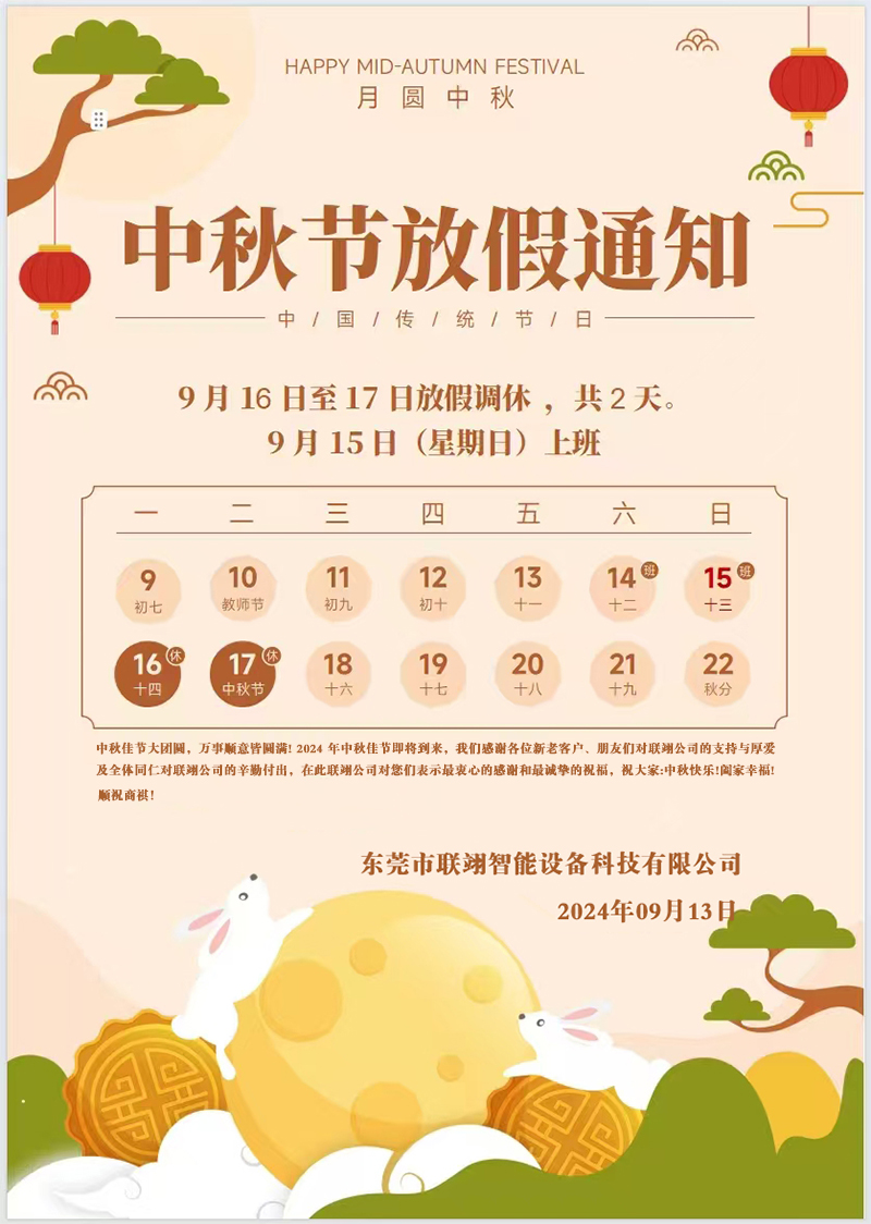 中秋佳節(jié)大團(tuán)圓,萬(wàn)事順意皆圓滿! 2024 年中秋佳節(jié)即將到來(lái),我們感謝各位新老客戶、朋友們對(duì)聯(lián)翊公司的支持與厚愛(ài)及全體同仁對(duì)聯(lián)翊公司的辛勤付出,在此聯(lián)翊公司對(duì)您們表示最衷心的感謝和最誠(chéng)摯的祝福,祝大家:中秋快樂(lè)!闔家幸福!