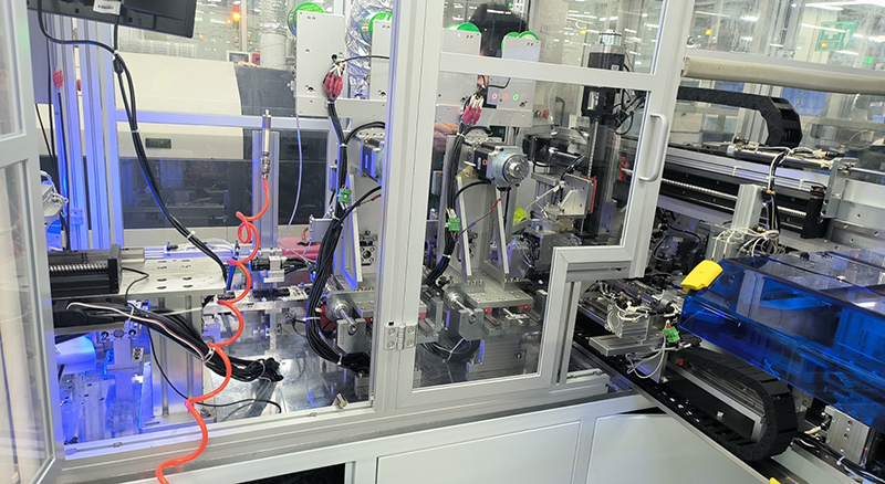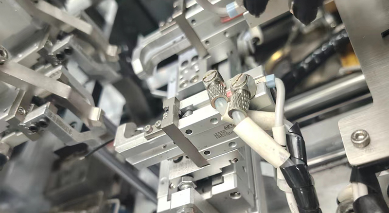 3、自動組裝:設(shè)備中的組裝模塊利用機(jī)械手或夾具完成螺絲和彈簧的對接、擰緊、焊接、粘合等組裝操作。